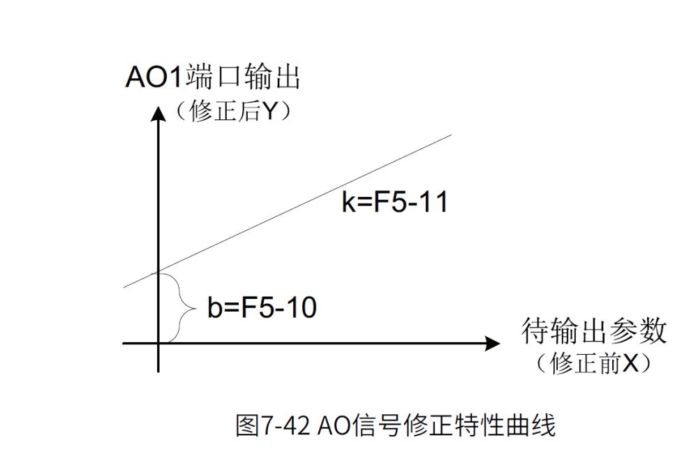 标配1个模拟量输出端子AO1。如果模拟量输出端子不能满足现场应用,则可选配“IO扩展卡”。例如MD38IO1 包含1个模拟量输出端子AO2。AO1、AO2可用于模拟量方式指示内部运行参数,所指示的参数属性可通过参数F5-07、F5-08来选择。通过AO输出曲线可以修正模拟输出的零漂及输出幅值的偏差,如下图所示。若零偏用“b”表示,增益用k表示,实际输出用Y表示,标准输出用X表示,则实际输出为:Y=kX+b。