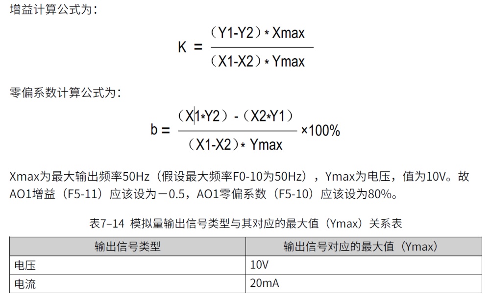 例如,若模拟输出内容为运行频率,希望频率为0Hz时,修正后输出8V,频率为40Hz时,修正后输出4V。则AO1增益(F5-11)应该设为-0.5,AO1零偏系数(F5-10)应该设为80%。AO(模拟量输出)0~10V对应0%~100%,当AO2输出功能为1(频率设定)时,如果变频器设定频率为最大频率的50%,则AO2的输出电压为50%×10 V= 5V。AO零偏系数(F5-10或者F5-12)和AO增益的(F5-11或者 F5-10)计算方法如下:若模拟输出内容为运行频率,希望频率为0Hz(X1)时,修正后输出8V(Y1),频率为40Hz(X2)时,修正后输出4V(Y2)。